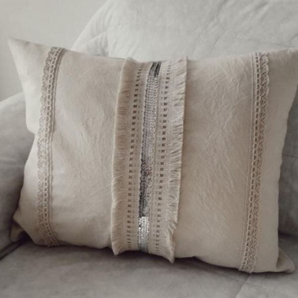Almohadón hecho a mano, realizado en lienzo natural. Medidas: 40 x 50 Relleno con vellón siliconado, con cierre en la parte inferior para facilitar su lavado.