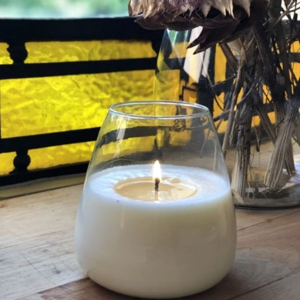 Vaso de vidrio Bombe de 12 cm de alto x 11 cm de diámetro y pabilo de algodón. Perfume en vela por mas de 100 hs. Vela de soja hecha a mano en Buenos Aires. Fórmula original que combina aceites vegetales, pabilos de algodón 100%, envases reutilizables y deliciosas fragancias.French Vainilla - Nardos